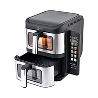 FREIDORA DE AIRE CON PANEL DIGITAL A COLOR MARCA MIRATI HOME CON PANEL RETRACTIL CON 2 VENTANAS EN VERTICAL PARA VISUALIZAR LOS ALIMENTOS CAPACIDAD DE 11 LITROS (DOS CANASTAS DE 5.5L CADA UNA) POTENCIA: 1800W TEMPORIZADOR DE HASTA 60 MIN TEMPERATURA DESDE 60